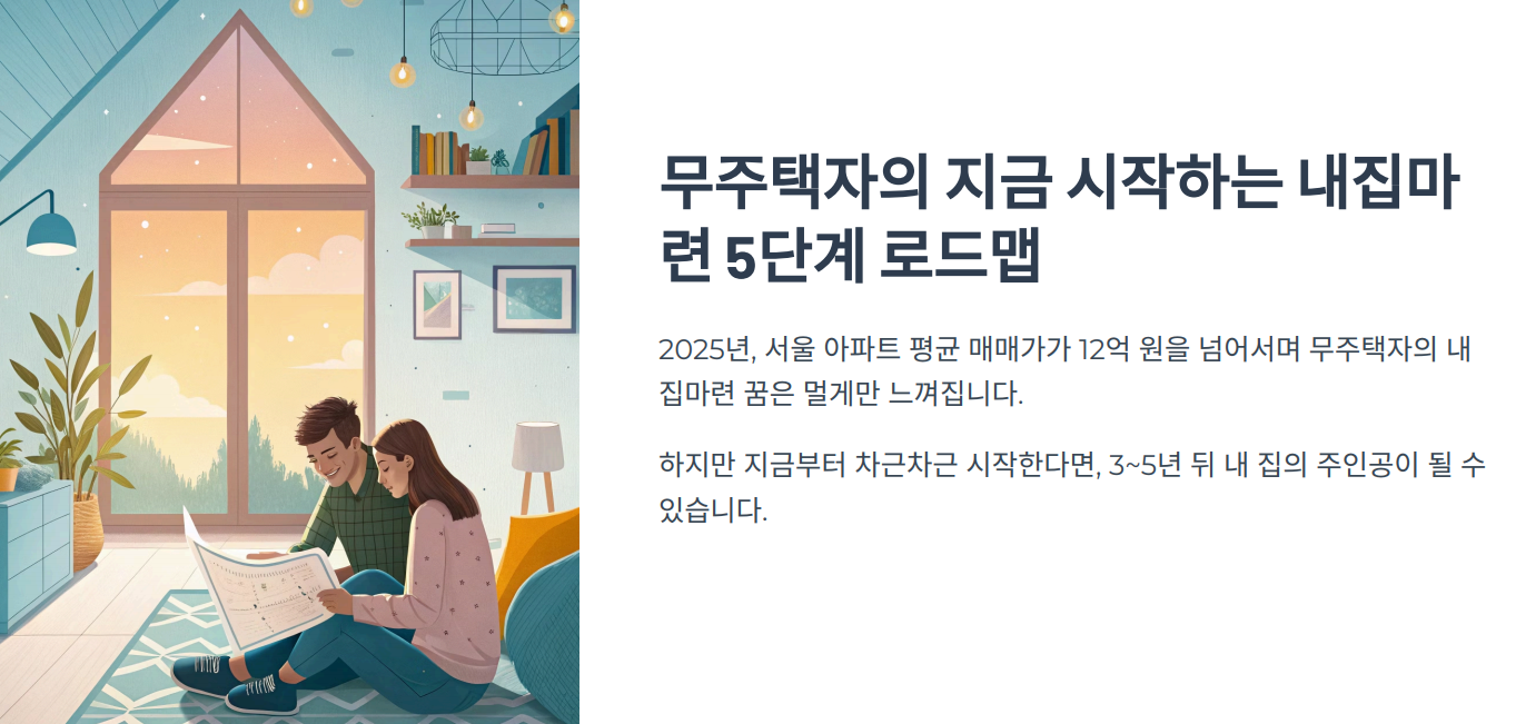 2025년, 서울 아파트 평균 매매가가 12억 원을 넘어서며 무주택자의 내집마련 꿈은 멀게만 느껴집니다. 하지만 지금부터 차근차근 시작한다면, 3~5년 뒤 내 집의 주인공이 될 수 있습니다. 당장 집을 사는 게 아니라, 2025년부터 한 발짝씩 준비하는 현실적인 로드맵을 함께 그려보겠습니다.