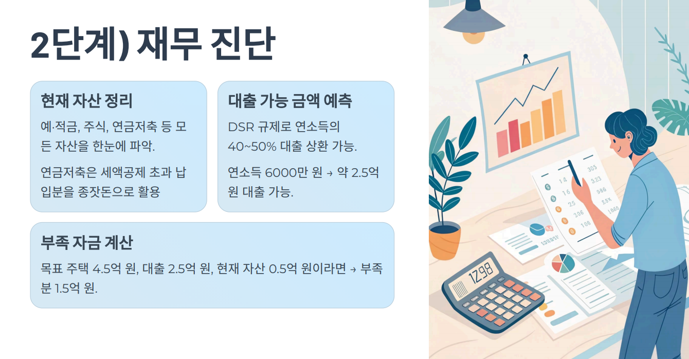 목표 주택 4.5억 원, 대출 2.5억 원, 현재 자산 0.5억 원이라면 → 부족분 1.5억 원. 5년간 모을 목표 설정!