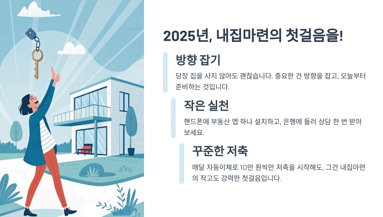 2025년 올해부터 하나씩 실천하면서 여러분의 꿈을 키워보시길 바랍니다. 당장 집을 사지 않아도 괜찮습니다. 중요한 건 방향을 잡고, 오늘부터 준비하는 것입니다.